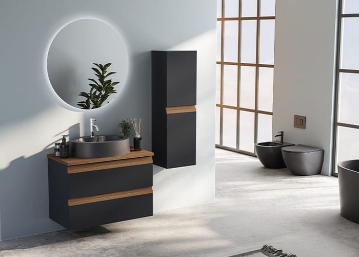 Tasarımdaki dikdörtgen çizgi farklı tonlardaki akrilik lake ve desen kulp kombinasyonu ile öne çıkıyor. Kullanılan entegre akrimer lavabolar ise banyolarda hijyenik bir görüntü sağlar.