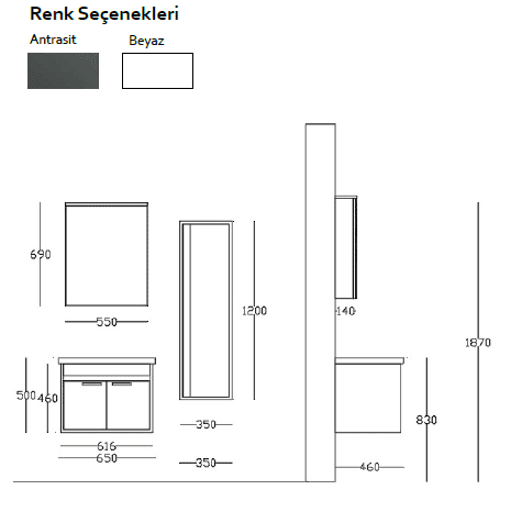 Bagnora MARE 65 cm Banyo Dolabı – Beyaz/Antrasit (Boy Dolaplı)