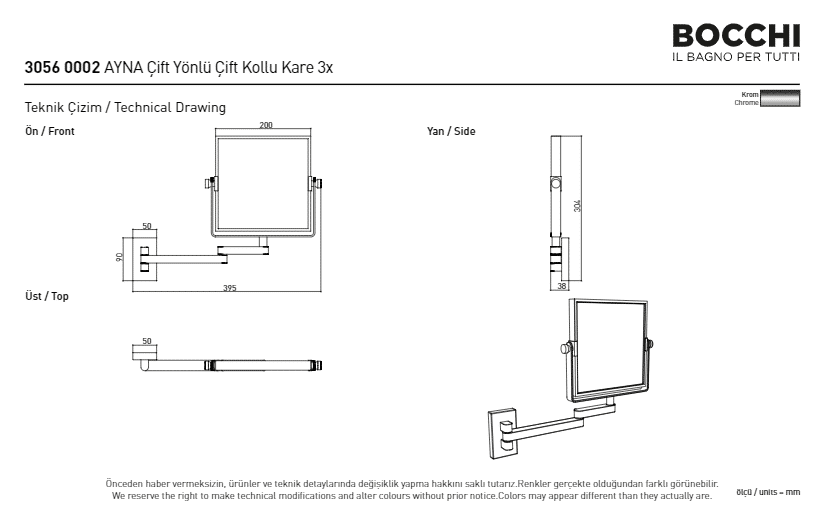 Bocchi Ayna Büyüteçli Çift Kollu Çift Yönlü Kare Büyüteçli Ayna – Led Işıksız Çift Kollu Çift Yönlü Kare 3X Krom