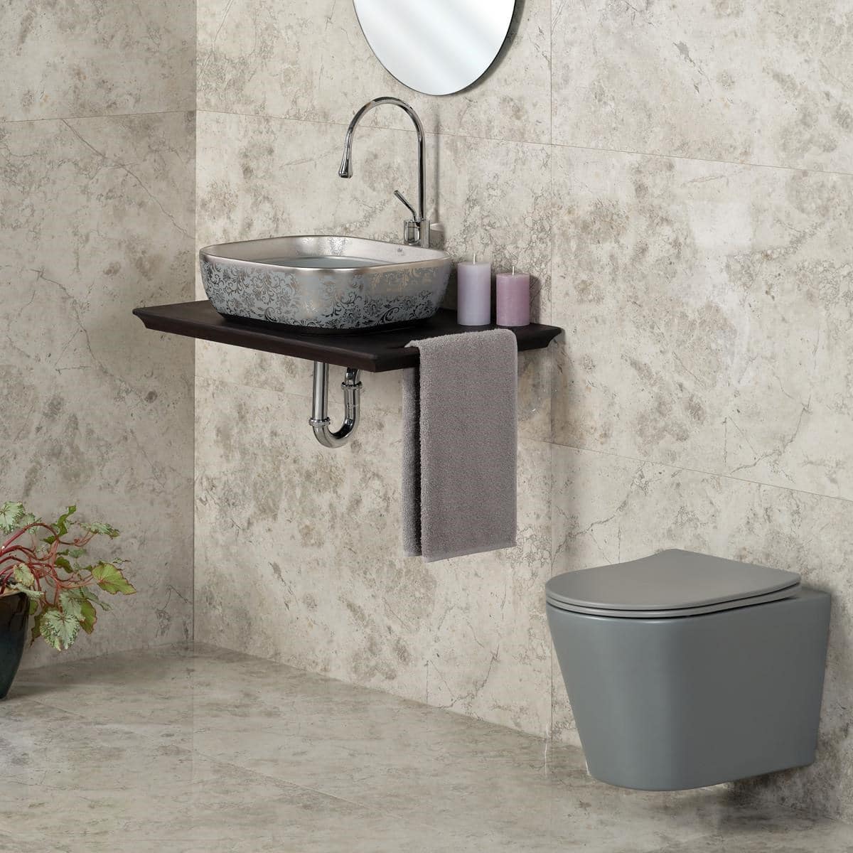 *Mat Gri gövdeye dış kısımda gümüş çiçek desenler işlenmiş ve iç kısımda üst kenarları kaplayan gümüş şeritli oval köşeli tezgah üstü lavabo