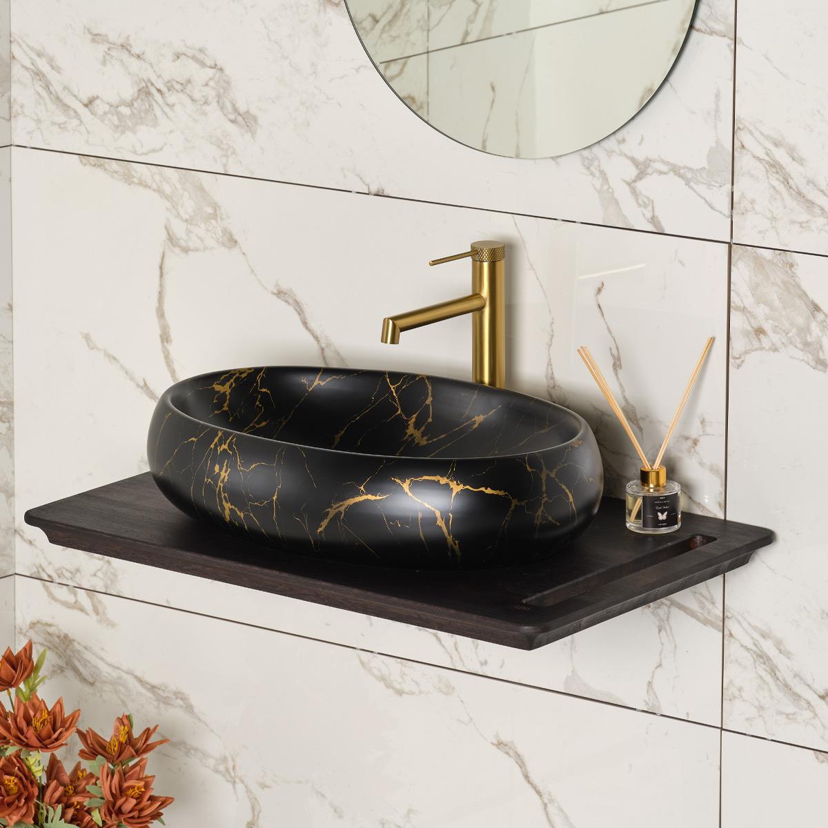 *Siyah – Altın mermer görünümlü tezgah üstü lavabo