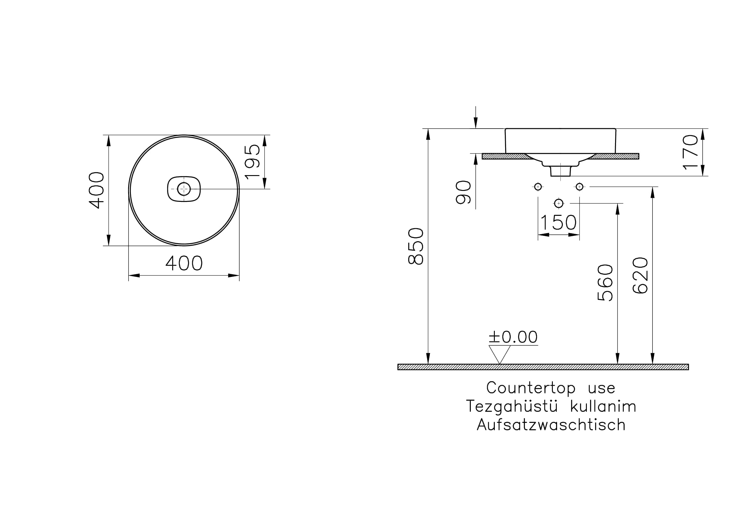 Vitra Metropole Çanak Lavabo Yuvarlak, 40×40 cm Armatür Deliksiz, Su Taşma Deliksiz, Mat Beyaz